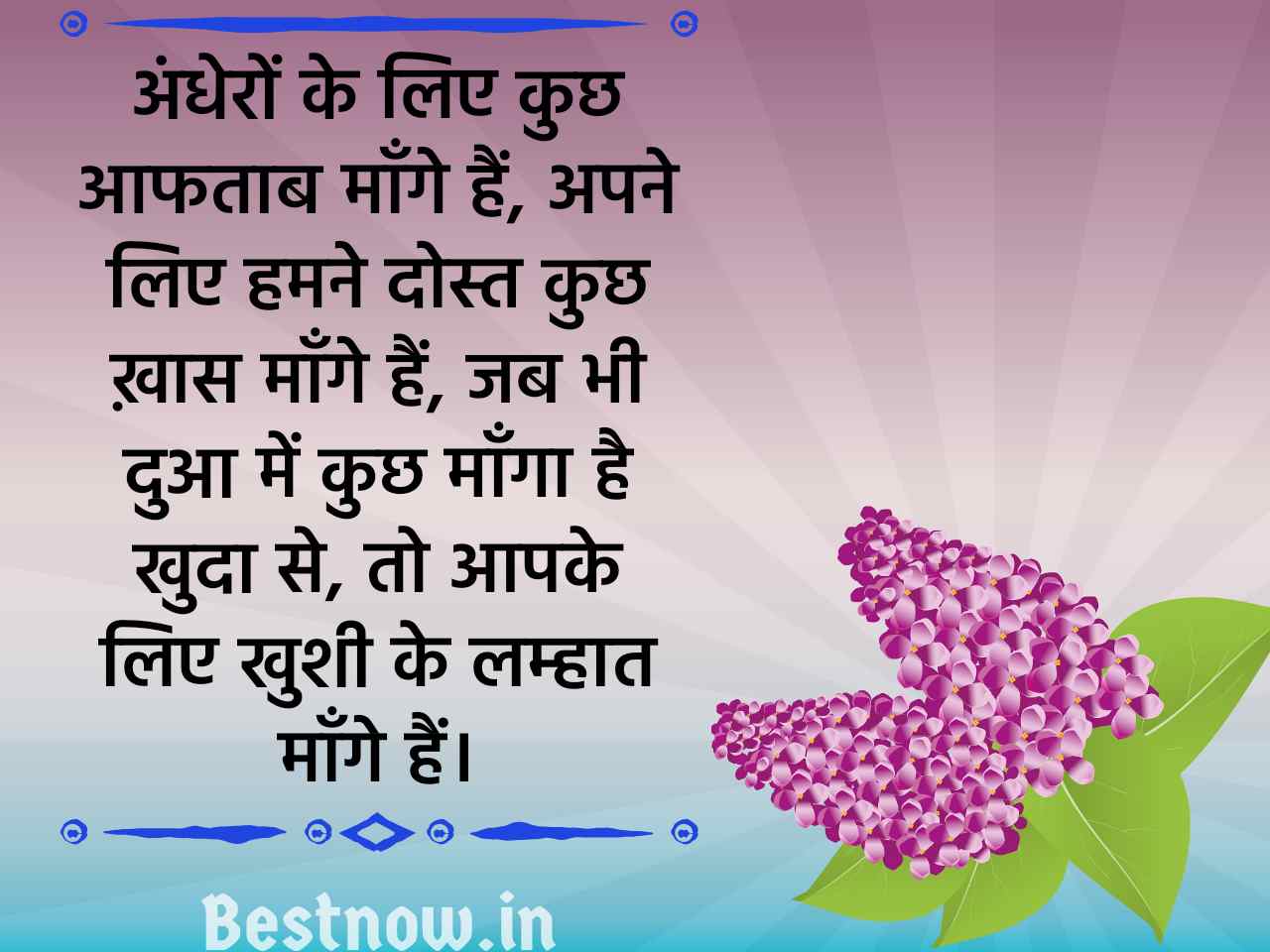 अंधेरों के लिए कुछ आफताब माँगे हैं, अपने लिए हमने दोस्त कुछ ख़ास माँगे हैं, जब भी दुआ में कुछ माँगा है खुदा से, तो आपके लिए खुशी के लम्हात माँगे हैं।