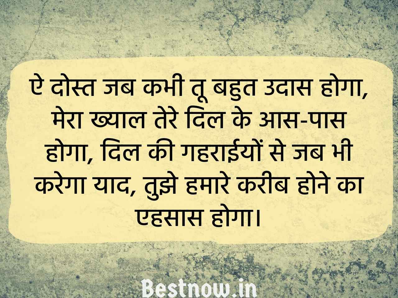 ऐ दोस्त जब कभी तू बहुत उदास होगा, मेरा ख्याल तेरे दिल के आस-पास होगा, दिल की गहराईयों से जब भी करेगा याद, तुझे हमारे करीब होने का एहसास होगा।