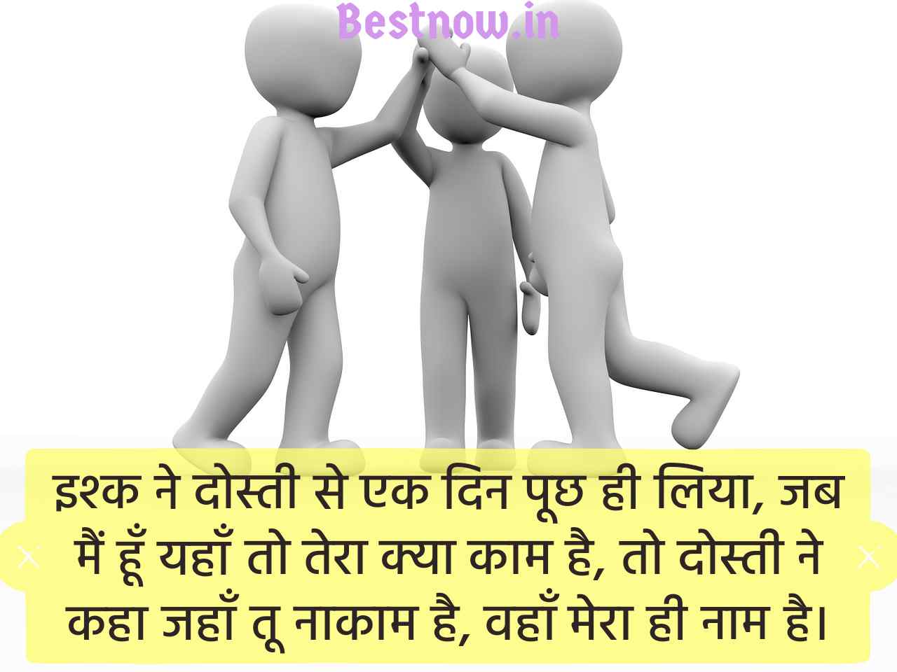 इश्क ने दोस्ती से एक दिन पूछ ही लिया, जब मैं हूँ यहाँ तो तेरा क्या काम है, तो दोस्ती ने कहा जहाँ तू नाकाम है, वहाँ मेरा ही नाम है।
