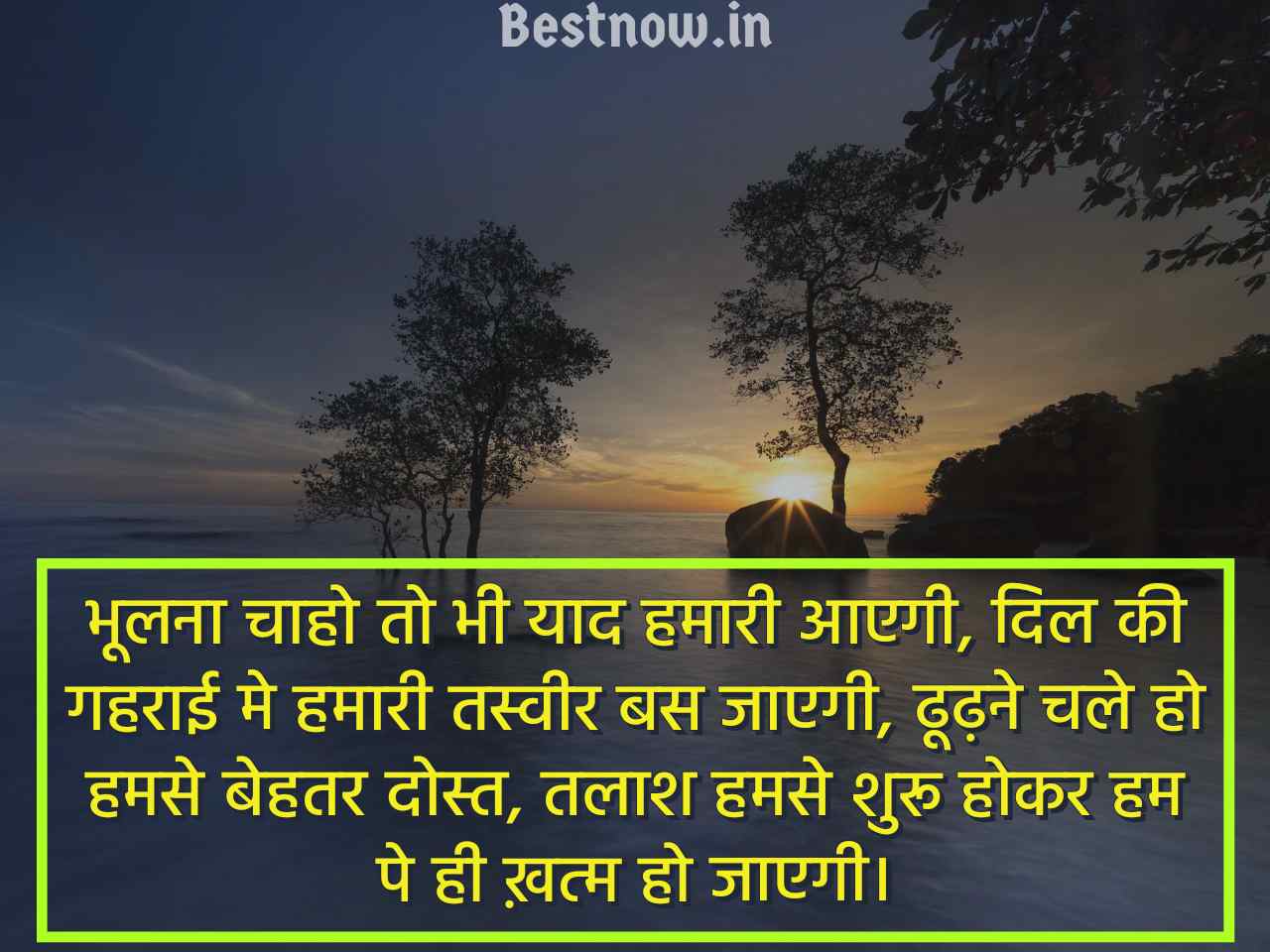 भूलना चाहो तो भी याद हमारी आएगी, दिल की गहराई मे हमारी तस्वीर बस जाएगी, ढूढ़ने चले हो हमसे बेहतर दोस्त, तलाश हमसे शुरू होकर हम पे ही ख़त्म हो जाएगी।