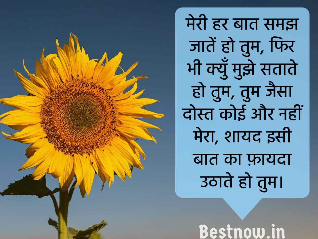 मेरी हर बात समझ जातें हो तुम, फिर भी क्युँ मुझे सताते हो तुम, तुम जैसा दोस्त कोई और नहीं मेरा, शायद इसी बात का फ़ायदा उठाते हो तुम।