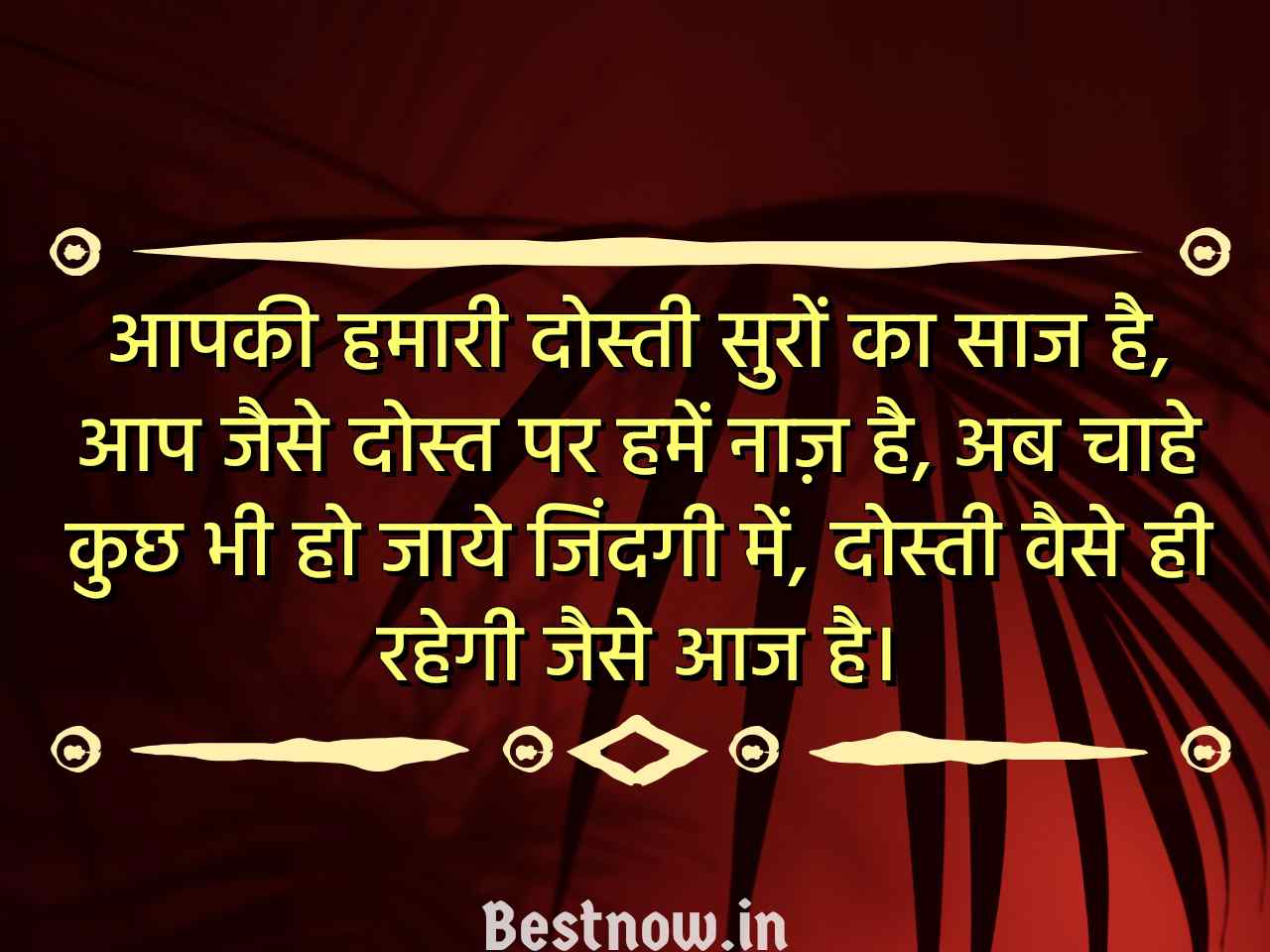 आपकी हमारी दोस्ती सुरों का साज है, आप जैसे दोस्त पर हमें नाज़ है, अब चाहे कुछ भी हो जाये जिंदगी में, दोस्ती वैसे ही रहेगी जैसे आज है।