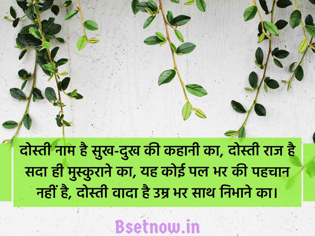 दोस्ती नाम है सुख-दुख की कहानी का, दोस्ती राज है सदा ही मुस्कुराने का, यह कोई पल भर की पहचान नहीं है, दोस्ती वादा है उम्र भर साथ निभाने का।