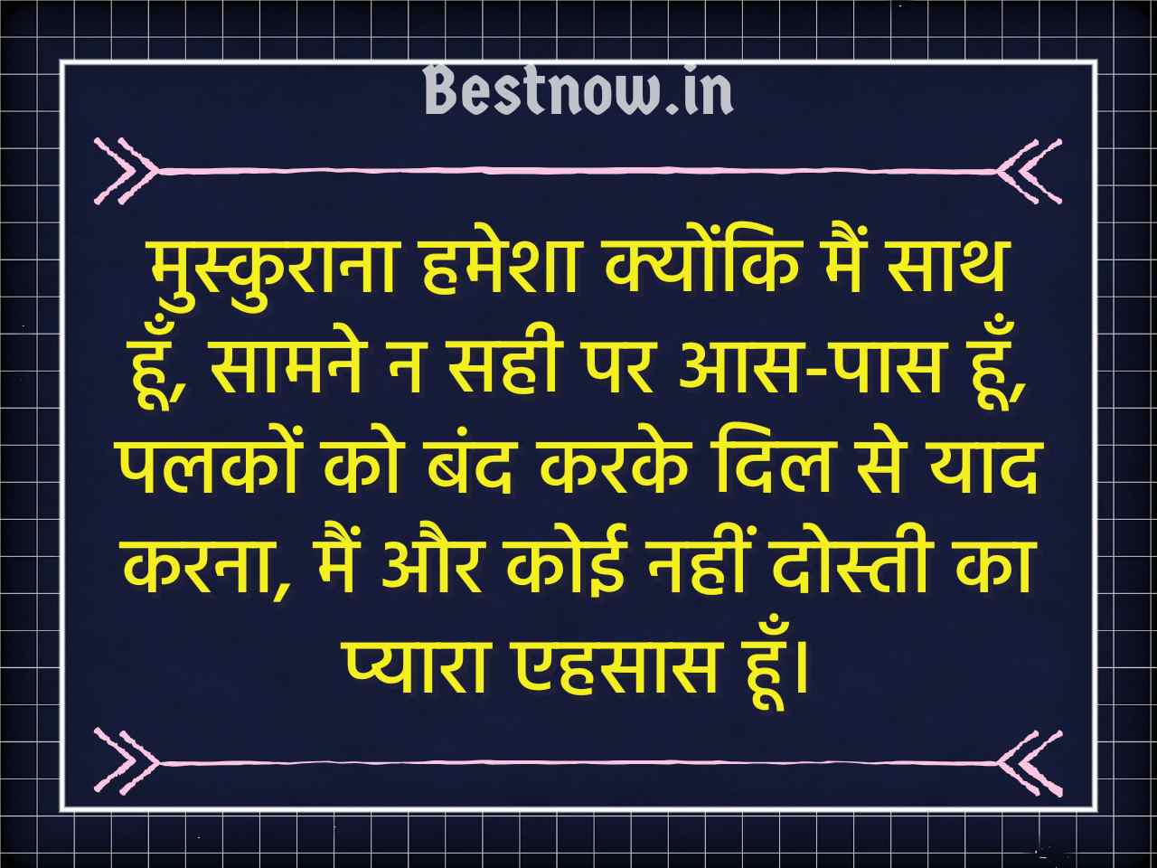 मुस्कुराना हमेशा क्युकी मैं साथ हूँ, सामने न सही पर आस-पास हूँ, पलकों को बंद करके दिल से याद करना, मैं और कोई नहीं दोस्ती का प्यारा एहसास हूँ।