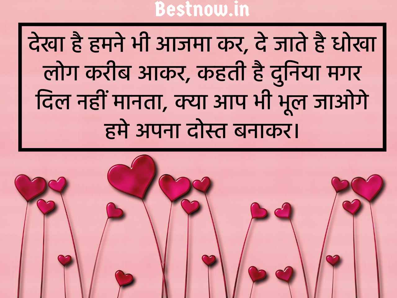 देखा है हमने भी आजमा कर, दे जाते है धोखा लोग करीब आकर, कहती है दुनिया मगर दिल नहीं मानता, क्या आप भी भूल जाओगे हमे अपना दोस्त बनाकर।