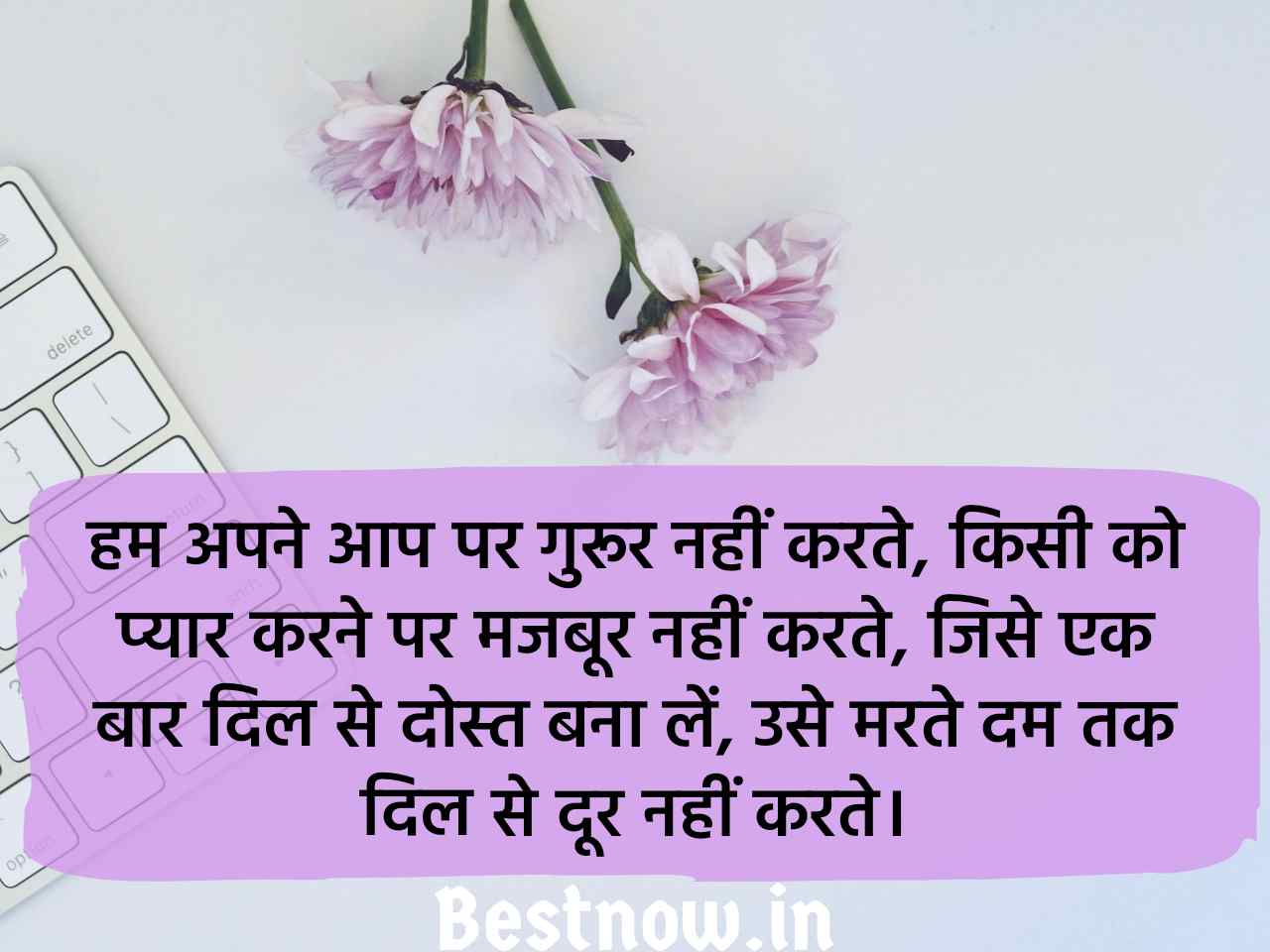 हम अपने आप पर गुरूर नहीं करते, किसी को प्यार करने पर मजबूर नहीं करते, जिसे एक बार दिल से दोस्त बना लें, उसे मरते दम तक दिल से दूर नहीं करते।