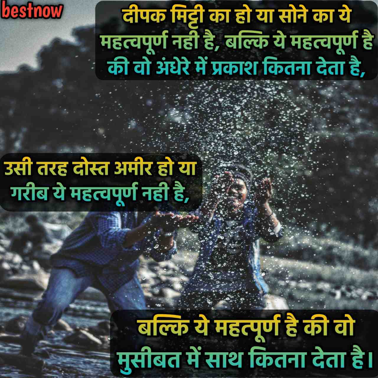 दीपक मिट्टी का हो या सोने का ये महत्वपूर्ण नही है, बल्कि ये महत्वपूर्ण है की वो अंधेरे में प्रकाश कितना देता है, उसी तरह दोस्त अमीर हो या गरीब ये महत्वपूर्ण नही है, बल्कि ये महत्पूर्ण है की वो मुसीबत में साथ कितना देता है।