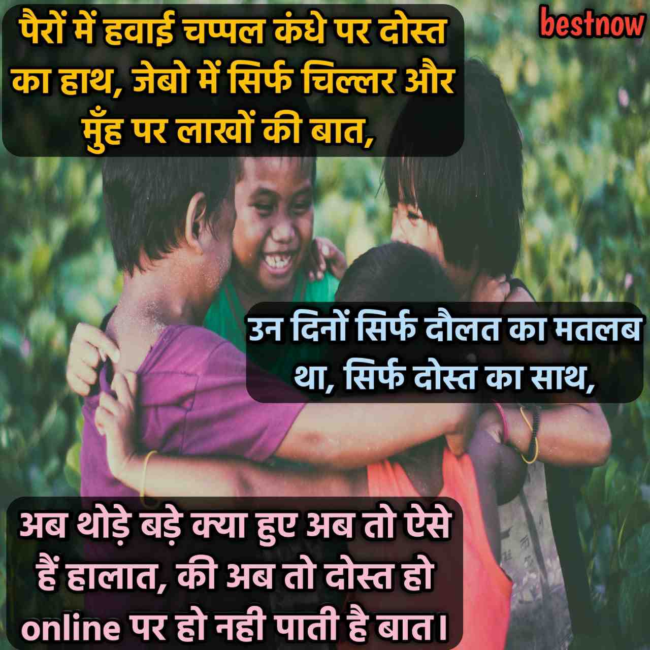 पैरों में हवाई चप्पल कंधे पर दोस्त का हाथ, जेबो में सिर्फ चिल्लर और मुँह पर लाखों की बात, उन दिनों सिर्फ दौलत का मतलब था, सिर्फ दोस्त का साथ, अब थोड़े बड़े क्या हुए अब तो ऐसे हैं हालात, की अब तो दोस्त हो Online पर हो नही पाती है बात।
