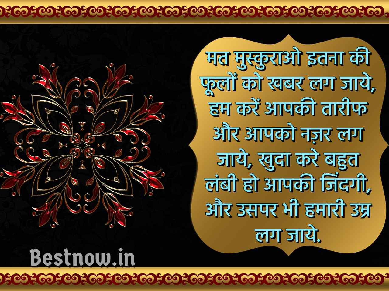 मत मुस्कुराओ इतना की फूलों को खबर लग जाये, हम करें आपकी तारीफ और आपको नज़र लग जाये, खुदा करे बहुत लंबी हो आपकी जिंदगी, और उसपर भी हमारी उम्र लग जाये।