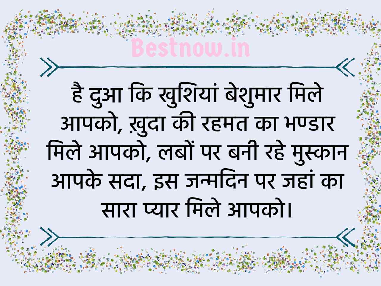 दुआ मिले बडो से, खुशियां मिले जग से, साथ मिले अपनों से, रेहमत मिले रब से, ज़िन्दगी में आप को बे पनाह प्यार मिले, खुश रहे आप दुनिया में ज्यादा सब से, “Happy birthday”