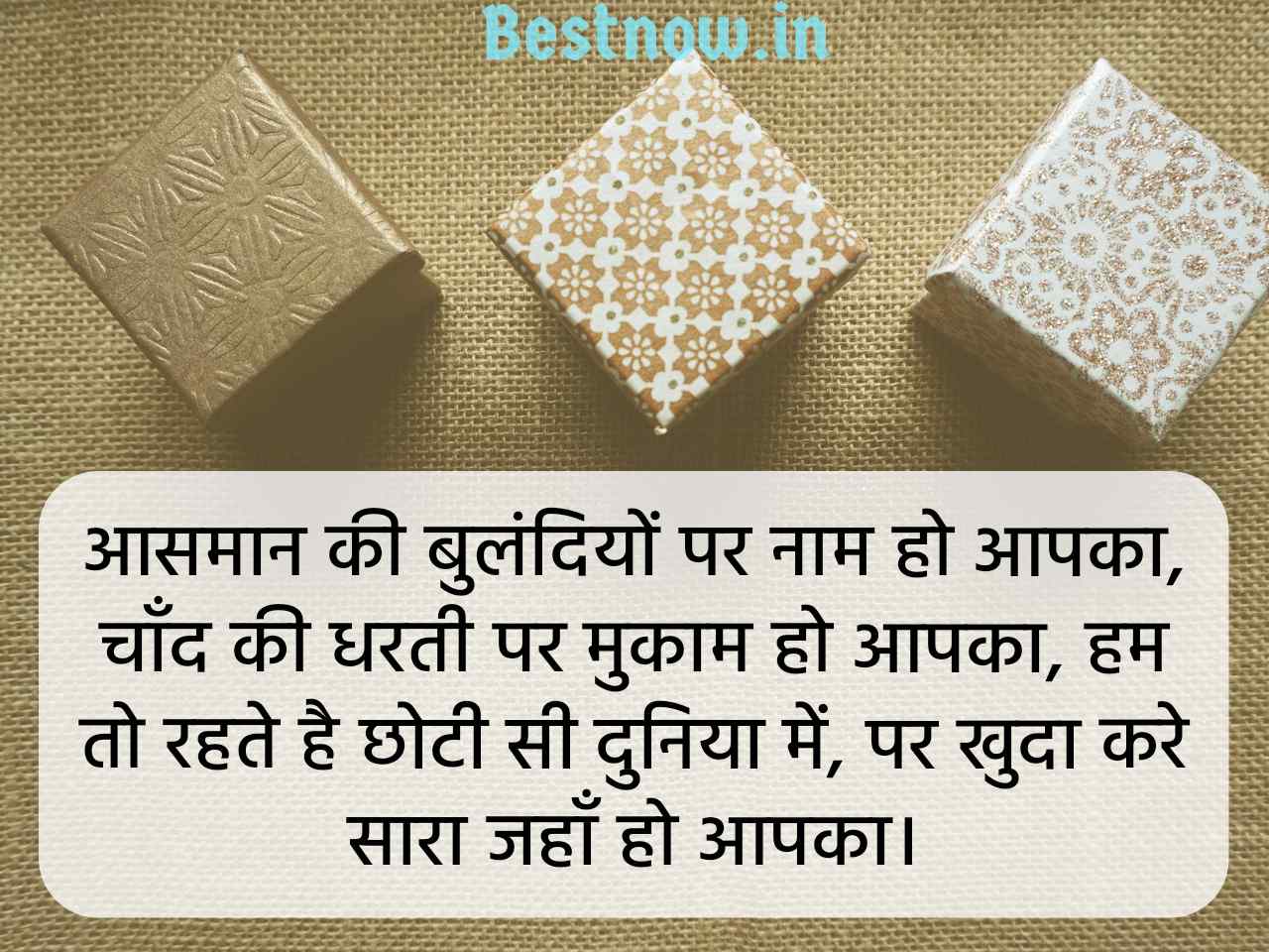 आसमान की बुलंदियों पर नाम हो आपका, चाँद की धरती पर मुकाम हो आपका, हम तो रहते है छोटी सी दुनिया में, पर खुदा करे सारा जहाँ हो आपका।