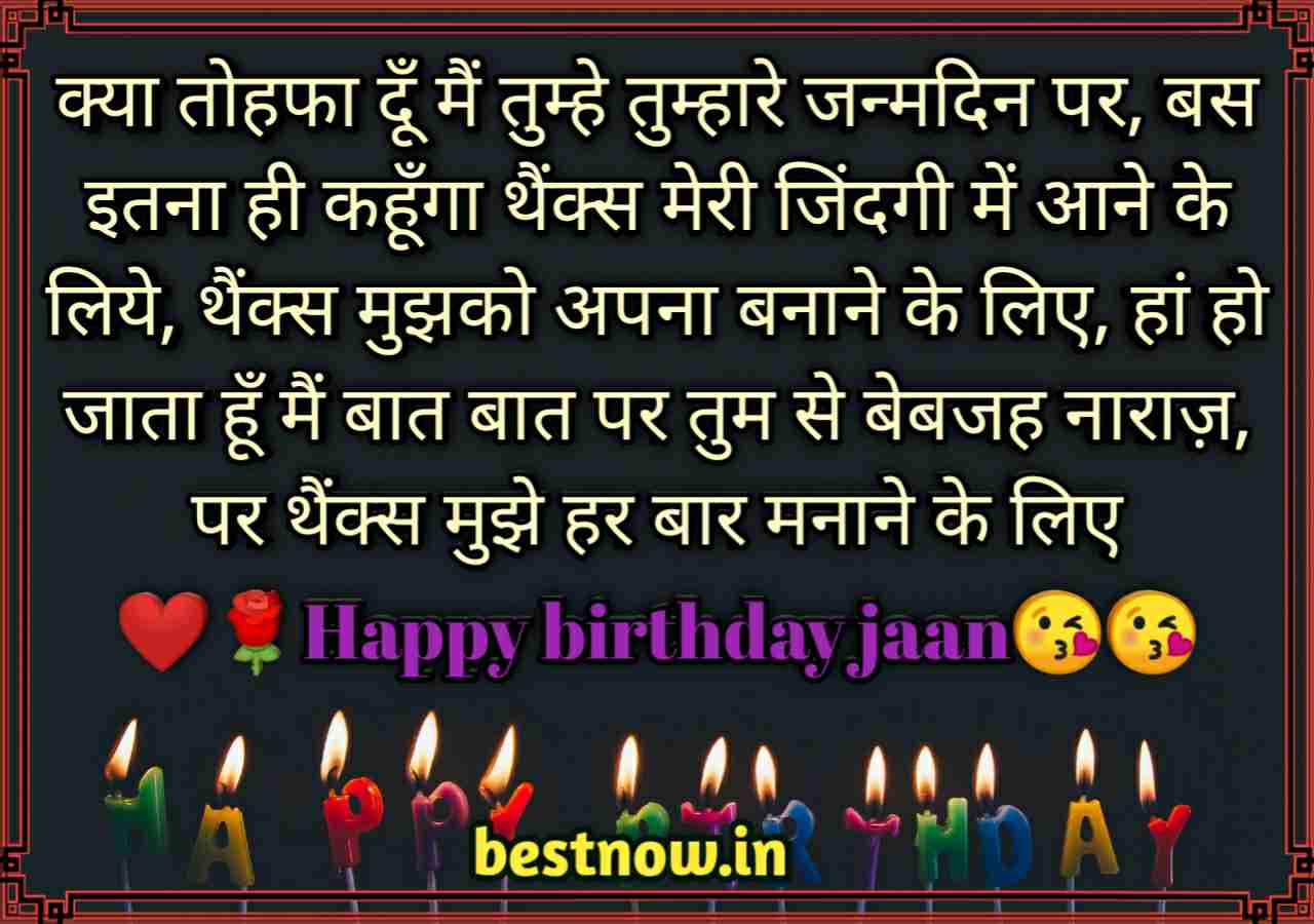 क्या तोहफा दूँ मैं तुम्हे तुम्हारे जन्मदिन पर, बस इतना ही कहूँगा थैंक्स मेरी जिंदगी में आने के लिये, थैंक्स मुझको अपना बनाने के लिए, हां हो जाता हूँ मैं बात बात पर तुम से बेबजह नाराज़, पर थैंक्स मुझे हर बार मनाने के लिए