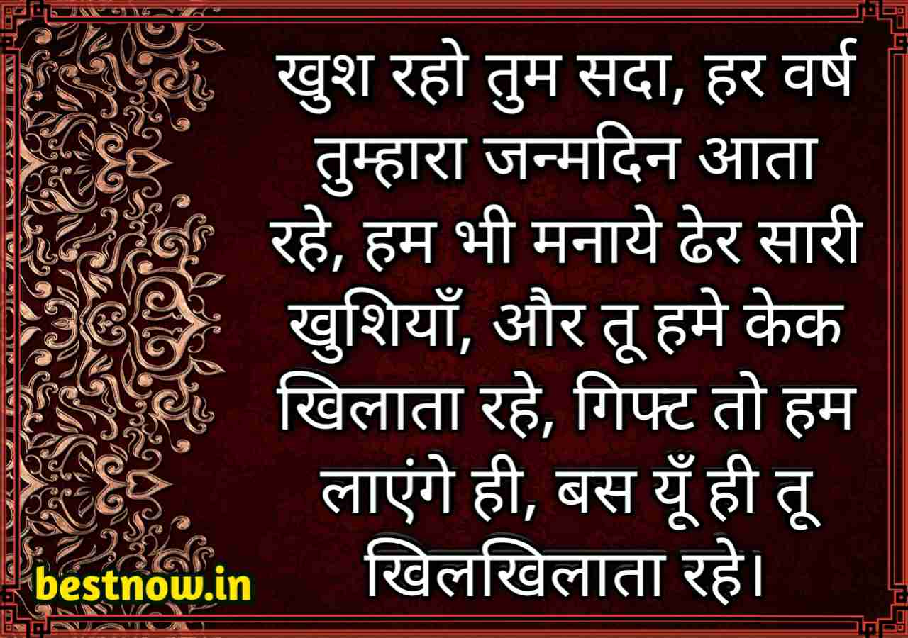 तुमसे न ख़ुशी कभी अलग जाए, देख तुम्हारी ख़ुशी गम दूर भाग जाए, तुम्हारे जन्मदिन पर बस यही दुआ मांगते है, की हमारी उम्र भी तुम को लग जाए।