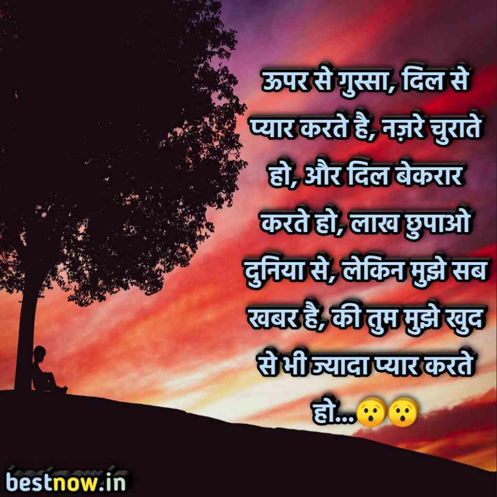 ऊपर से गुस्सा, दिल से प्यार करते है, नज़रे चुराते हो, और दिल बेकरार करते हो, लाख छुपाओ दुनिया से, लेकिन मुझे सब खबर है, की तुम मुझे खुद से भी ज्यादा प्यार करते हो…