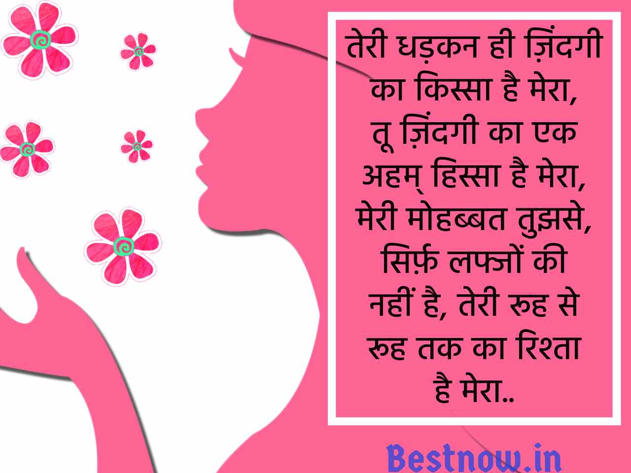 तेरी धड़कन ही ज़िंदगी का किस्सा है मेरा, तू ज़िंदगी का एक अहम् हिस्सा है मेरा, मेरी मोहब्बत तुझसे, सिर्फ़ लफ्जों की नहीं है, तेरी रूह से रूह तक का रिश्ता है मेरा।