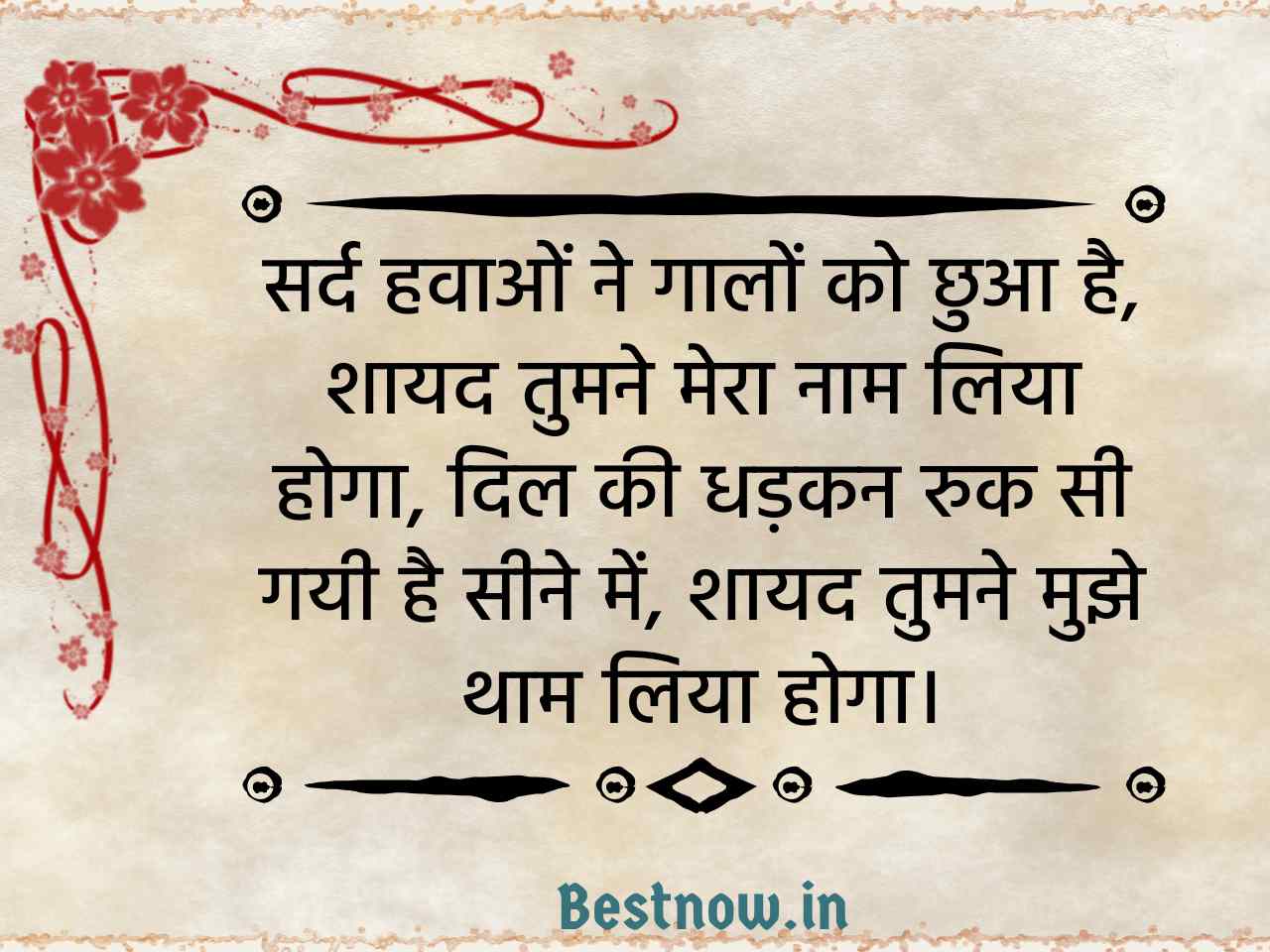 सर्द हवाओं ने गालों को छुआ है, शायद तुमने मेरा नाम लिया होगा, दिल की धड़कन रुक सी गयी है सीने में, शायद तुमने मुझे थाम लिया होगा।