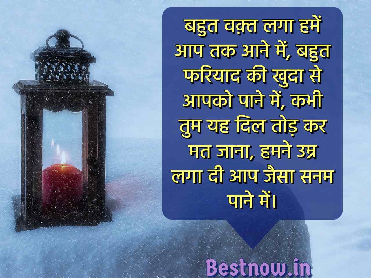 बहुत वक़्त लगा हमें आप तक आने में, बहुत फरियाद की खुदा से आपको पाने में, कभी तुम यह दिल तोड़ कर मत जाना, हमने उम्र लगा दी आप जैसा सनम पाने में।