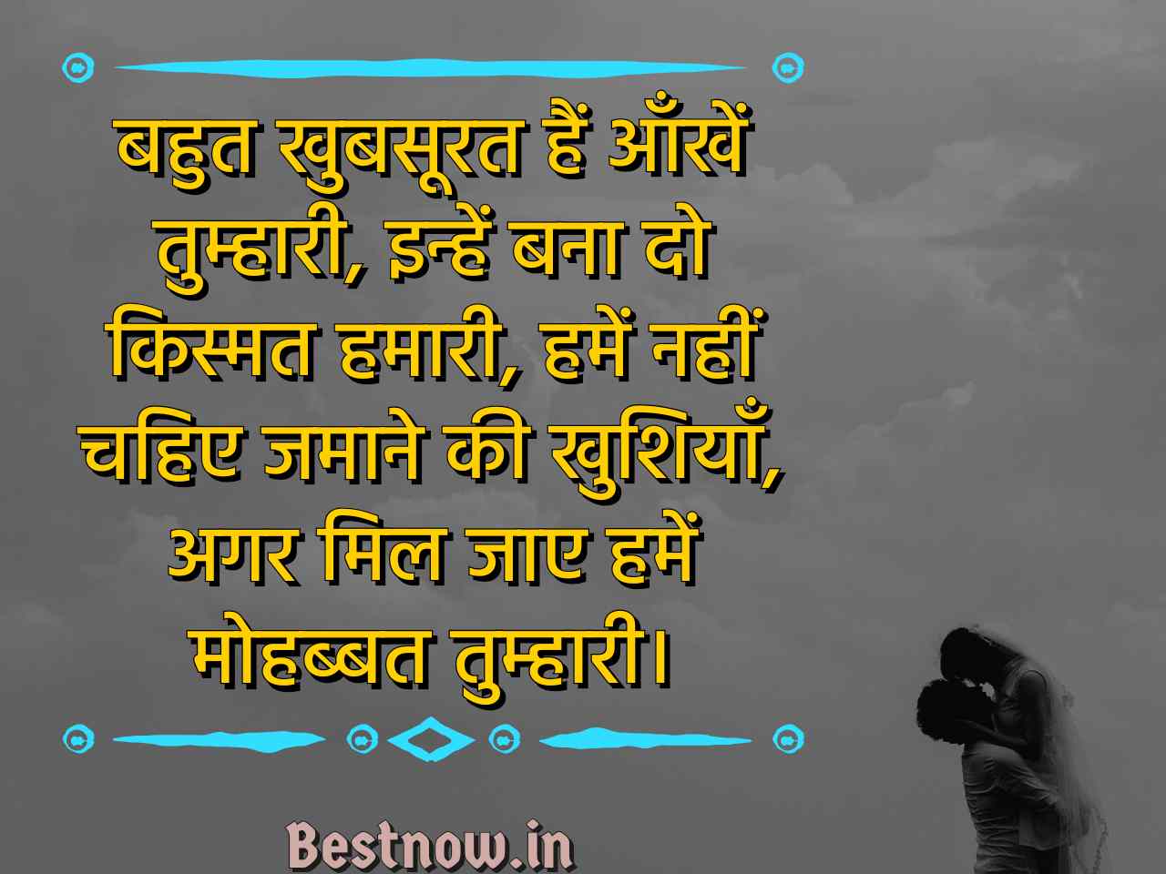 बहुत खुबसूरत हैं आँखें तुम्हारी, इन्हें बना दो किस्मत हमारी, हमें नहीं चहिए जमाने की खुशियाँ, अगर मिल जाए हमें मोहब्बत तुम्हारी।