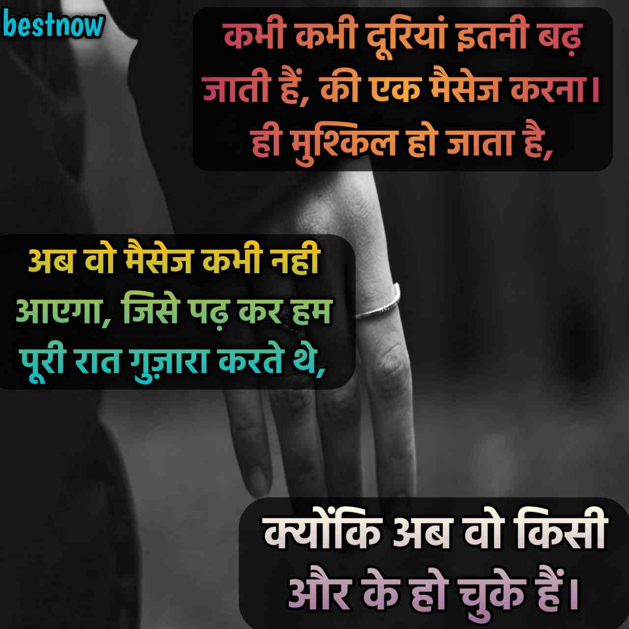 कभी कभी दूरियां इतनी बढ़ जाती हैं, की एक मैसेज करना। ही मुश्किल हो जाता है, अब वो मैसेज कभी नही आएगा, जिसे पढ़ कर हम पूरी रात गुज़ारा करते थे, क्योंकि अब वो किसी और के हो चुके हैं।