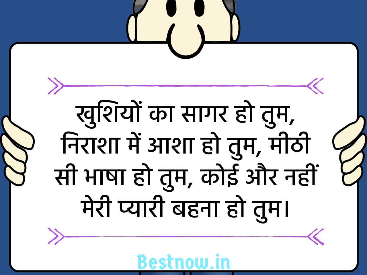 खुशियों का सागर हो तुम, निराशा में आशा हो तुम, मीठी सी भाषा हो तुम, कोई और नहीं मेरी प्यारी बहना हो तुम।