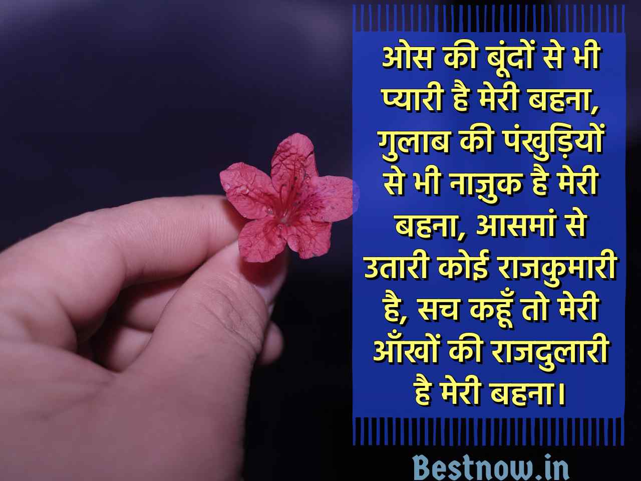ओस की बूंदों से भी प्यारी है मेरी बहना, गुलाब की पंखुड़ियों से भी नाज़ुक है मेरी बहना, आसमां से उतारी कोई राजकुमारी है, सच कहूँ तो मेरी आँखों की राजदुलारी है मेरी बहना।