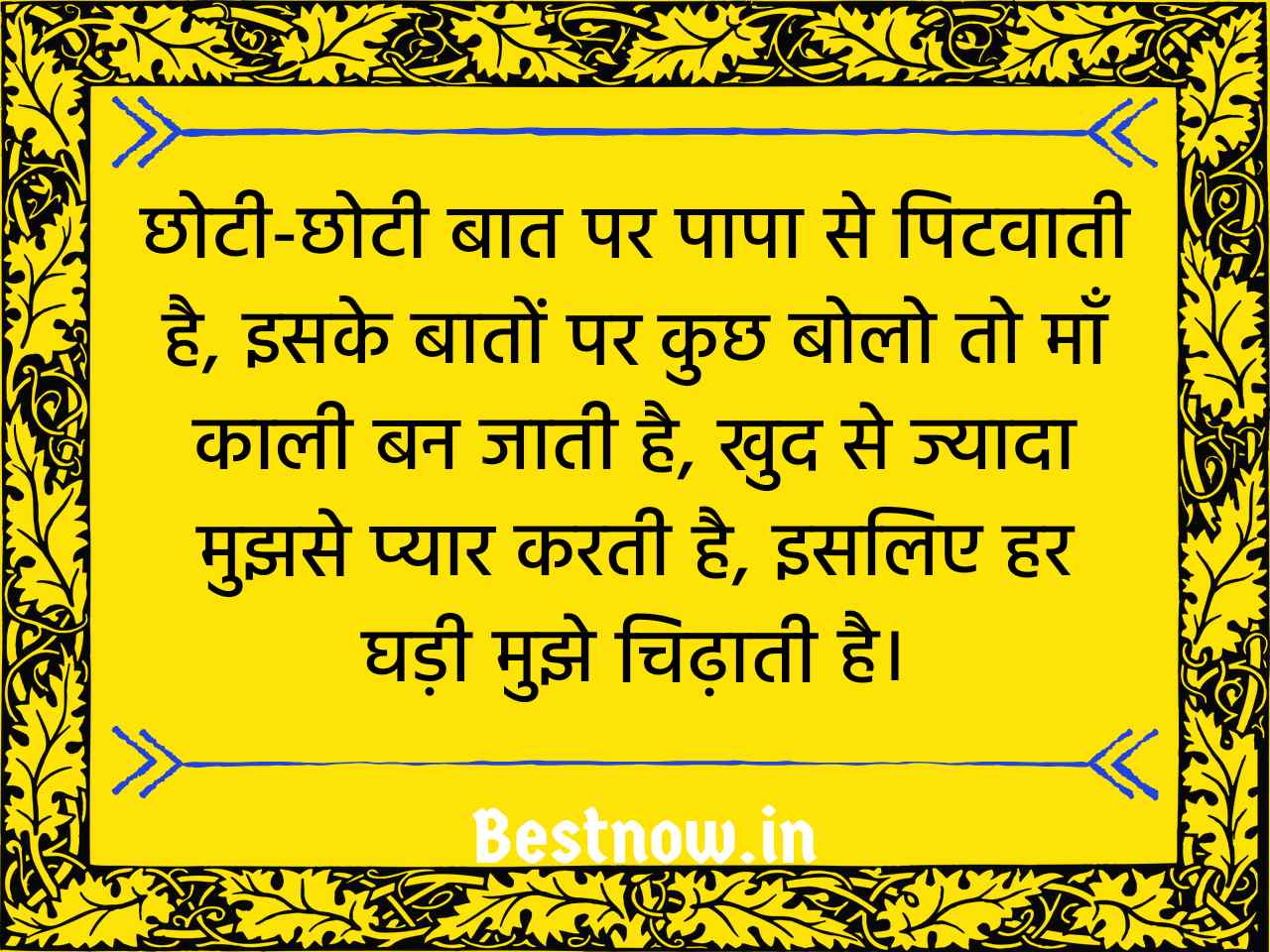 छोटी-छोटी बात पर पापा से पिटवाती है, इसके बातों पर कुछ बोलो तो माँ काली बन जाती है, खुद से ज्यादा मुझसे प्यार करती है, इसलिए हर घड़ी मुझे चिढ़ाती है।