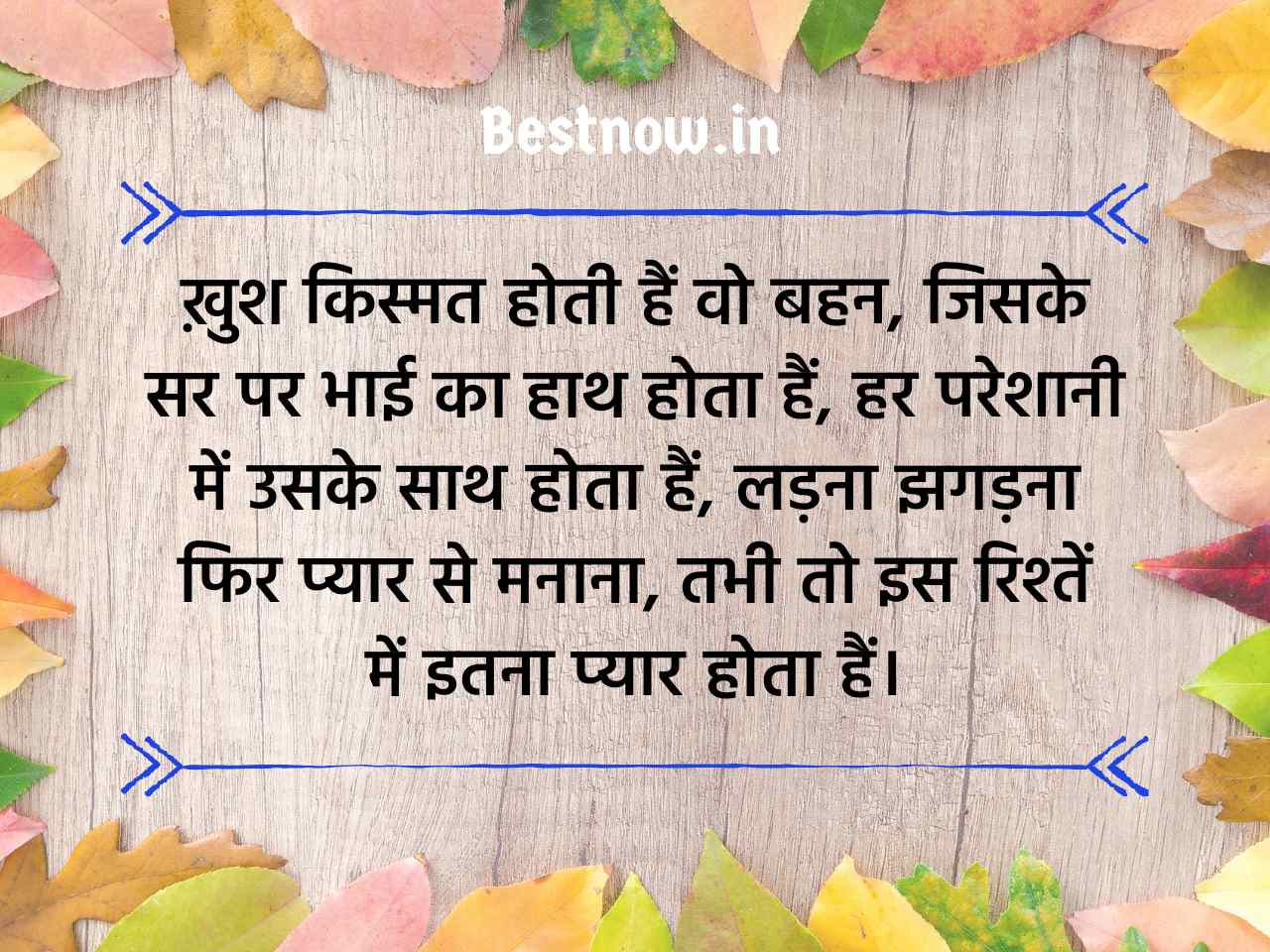 ख़ुश किस्मत होती हैं वो बहन, जिसके सर पर भाई का हाथ होता हैं, हर परेशानी में उसके साथ होता हैं, लड़ना झगड़ना फिर प्यार से मनाना, तभी तो इस रिश्तें में इतना प्यार होता हैं।