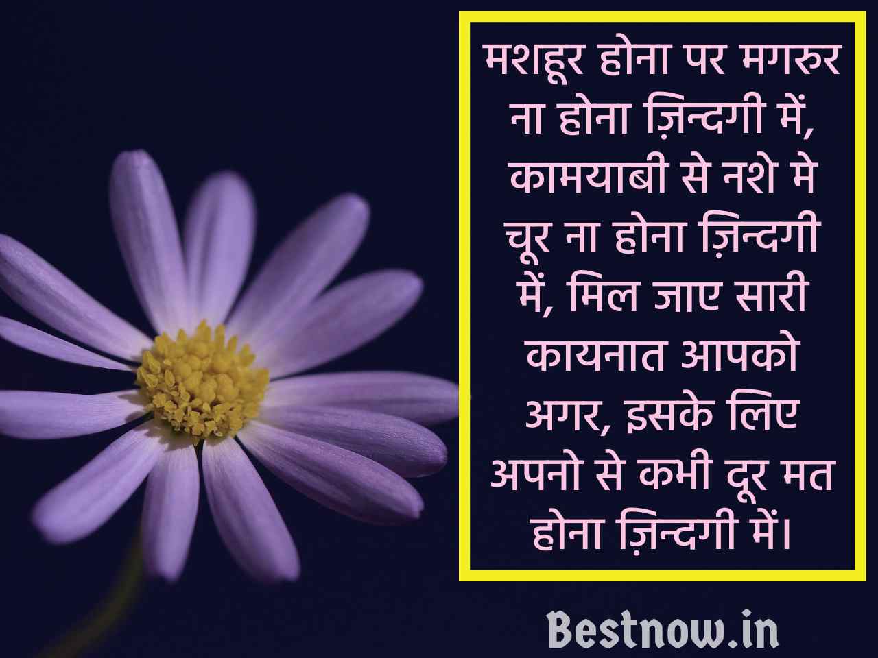 मशहूर होना पर मगरुर ना होना ज़िन्दगी में, कामयाबी से नशे मे चूर ना होना ज़िन्दगी में, मिल जाए सारी कायनात आपको अगर, इसके लिए अपनो से कभी दूर मत होना ज़िन्दगी में।
