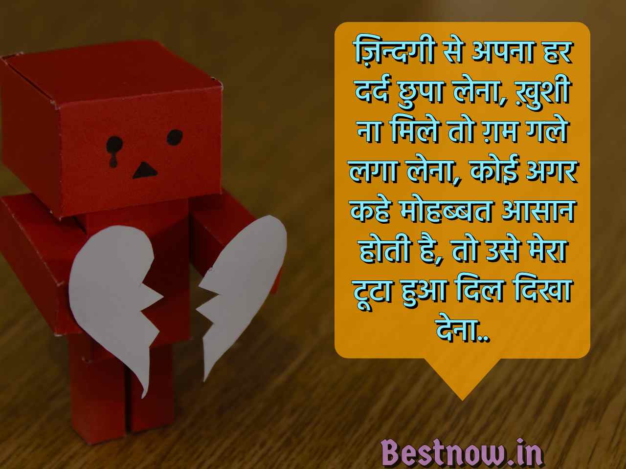 ज़िन्दगी से अपना हर दर्द छुपा लेना, ख़ुशी ना मिले तो ग़म गले लगा लेना, कोई अगर कहे मोहब्बत आसान होती है, तो उसे मेरा टूटा हुआ दिल दिखा देना।