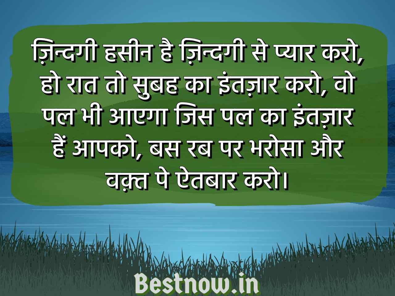 ज़िन्दगी हसीन है ज़िन्दगी से प्यार करो, हो रात तो सुबह का इंतज़ार करो, वो पल भी आएगा जिस पल का इंतज़ार हैं आपको, बस रब पर भरोसा और वक़्त पे ऐतबार करो।