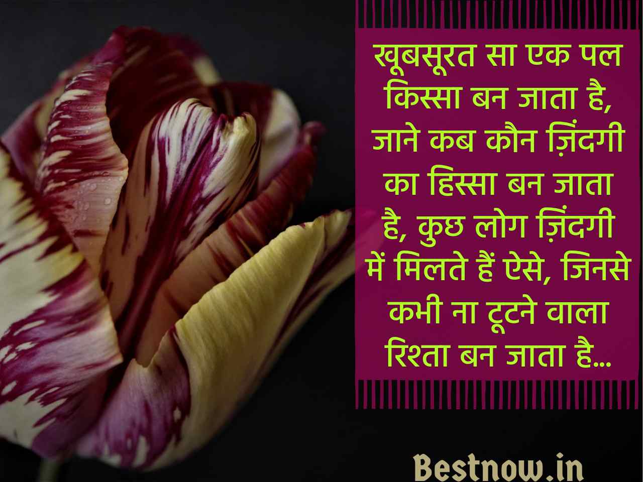 खूबसूरत सा एक पल किस्सा बन जाता है, जाने कब कौन ज़िंदगी का हिस्सा बन जाता है, कुछ लोग ज़िंदगी में मिलते हैं ऐसे, जिनसे कभी ना टूटने वाला रिश्ता बन जाता है।